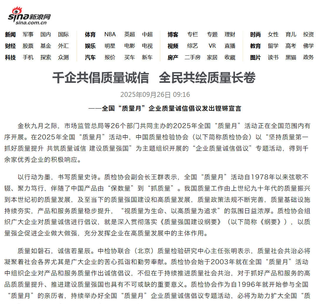 - 新浪網(wǎng)報(bào)道——千家企業(yè)發(fā)出倡議:視質(zhì)量為生命 以高質(zhì)量為追求——中國質(zhì)量檢驗(yàn)協(xié)會(huì)組織開展2025年全國“質(zhì)量月”企業(yè)質(zhì)量誠信倡議活動(dòng)