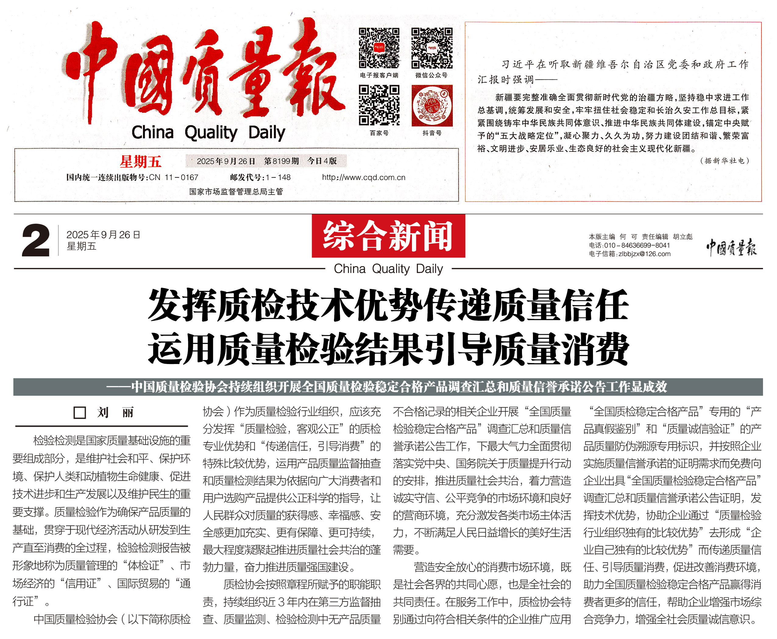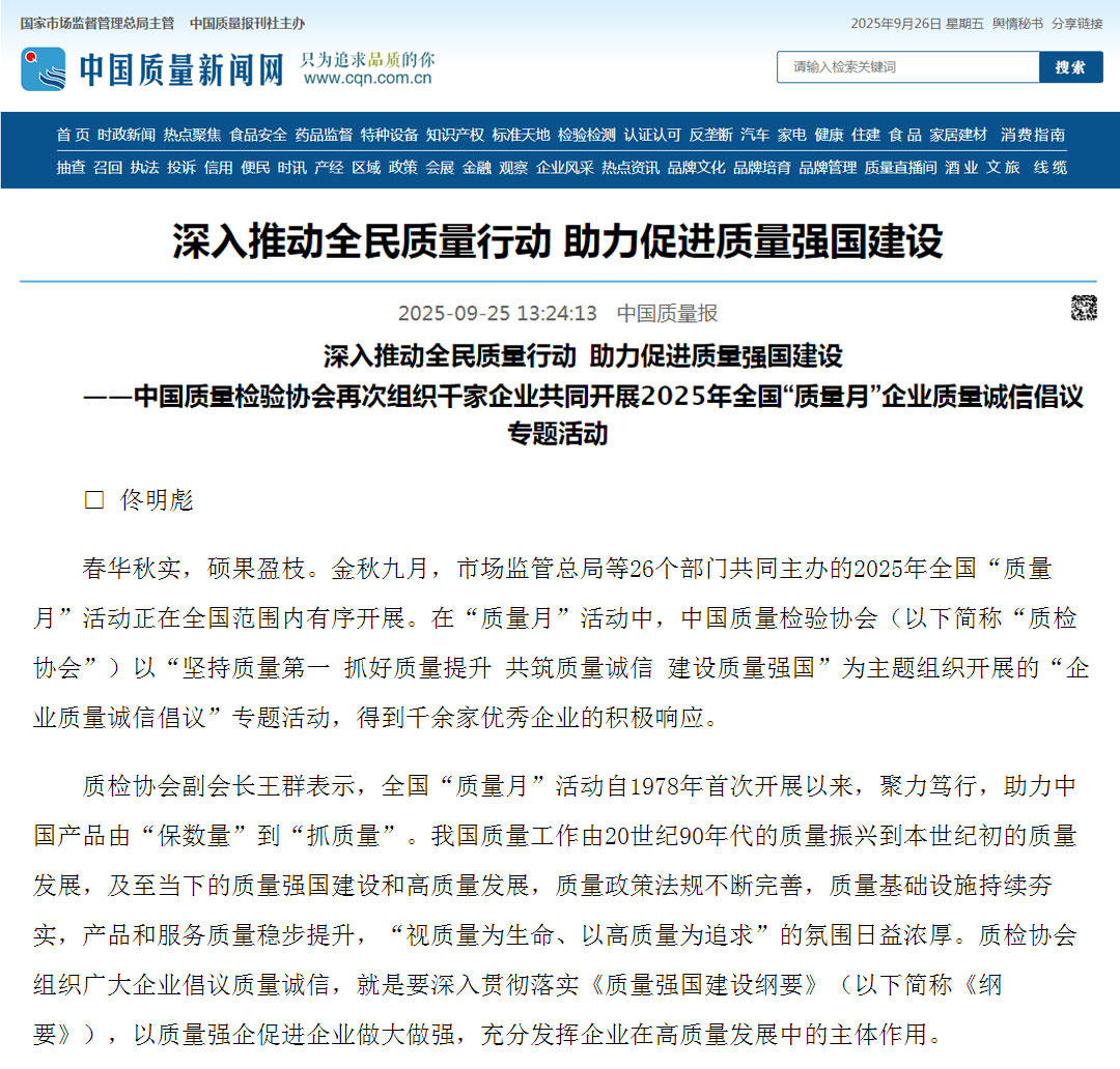 - 《中國質(zhì)量報(bào)》(2025年9月26日刊)發(fā)布:堅(jiān)持質(zhì)量第一 抓好質(zhì)量提升 共筑質(zhì)量誠信 建設(shè)質(zhì)量強(qiáng)國——2025年全國“質(zhì)量月”企業(yè)質(zhì)量誠信倡議書(2025年9月·北京)