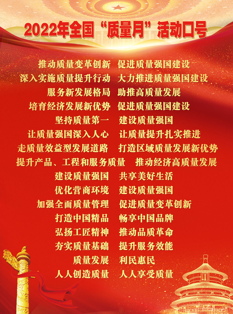 為深入貫徹習近平新時代中國特色社會主義思想,全面落實黨的十九大和十九屆歷次全會精神,立足新發(fā)展階段,完整、準確、全面貫徹新發(fā)展理念,構建新發(fā)展格局,樹立質(zhì)量第一的強烈意識,大力提升各行業(yè)質(zhì)量水平,推動經(jīng)濟加快發(fā)展,促進質(zhì)量強國建設,以實際行動迎接黨的二十大勝利召開,市場監(jiān)管總局等21個部門定于2022年9月聯(lián)合開展以“推動質(zhì)量變革創(chuàng)新 促進質(zhì)量強國建設”為主題的2022年全國“質(zhì)量月”活動。